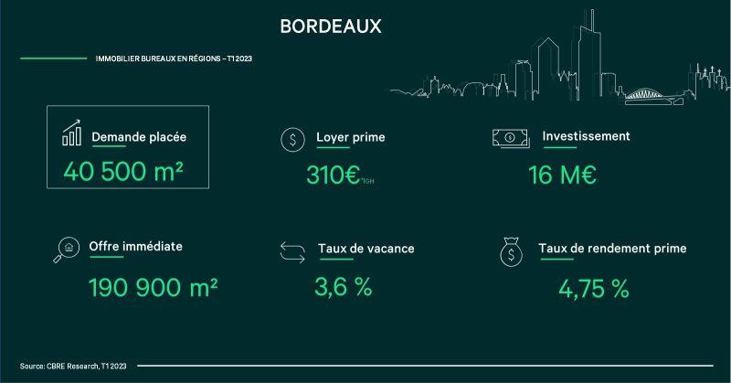 Le marché bordelais a enregistré un volume de 16 M€ investis sur le segment des bureaux, et ce, grâce à deux transactions à Bordeaux et Mérignac. Le taux de rendement prime au T1 2023 s’établit à 4,75 %.